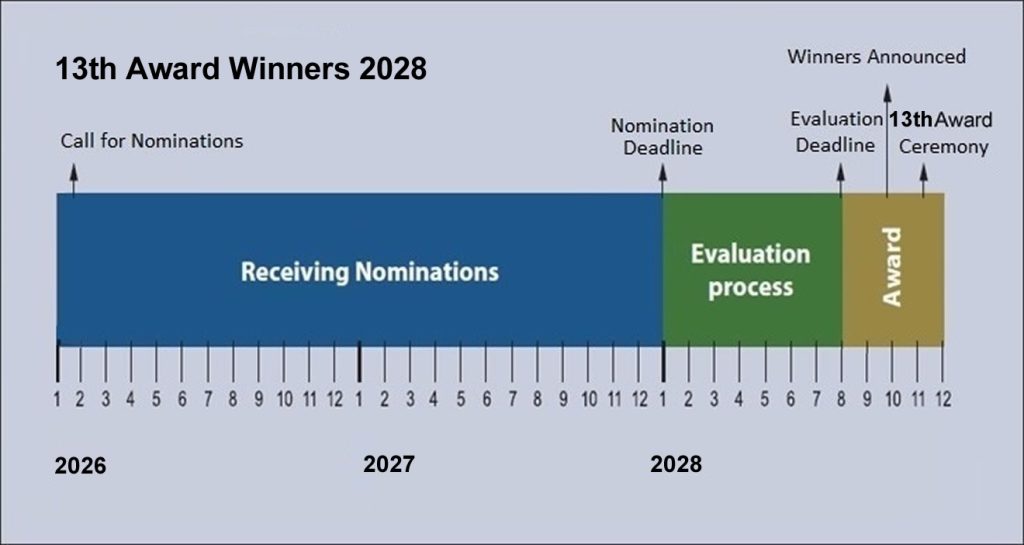 - October 2027: The Prize Council announces the winners of the 12th Award and calls for nominations to the 13th award.