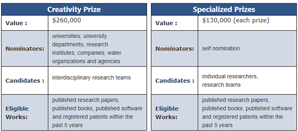Worth US$ 260,000, the Creativity Prize is awarded exclusively to research teams for cutting-edge interdisciplinary scientific work that can rightly be considered a breakthrough in any water-related field. The work might be a body of research, an invention, or a new patented technology. It is by nomination only. Universities, university departments, research institutes, companies, and agencies can nominate interdisciplinary teams for this Prize.