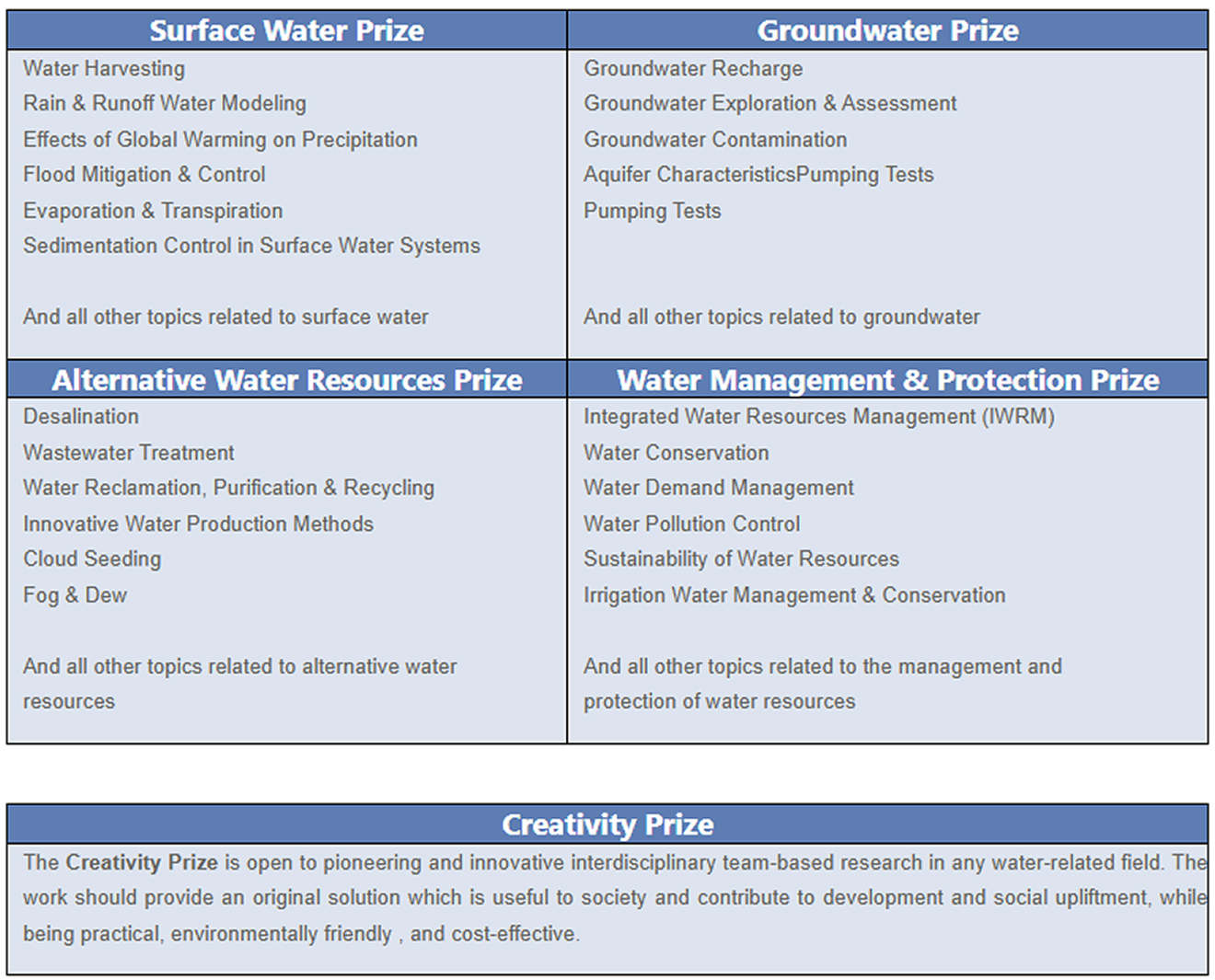 The Surface Water Prize coves every aspect of the study and development of surface water resources. The Groundwater Prize awards work related to all aspects of the study and development of groundwater resources. The Alternative Water Resources Prize covers desalination, waste water treatment, and other non-traditional sources of water. The Water Management & Protection Prize addresses the use, management, and protection of water resources.